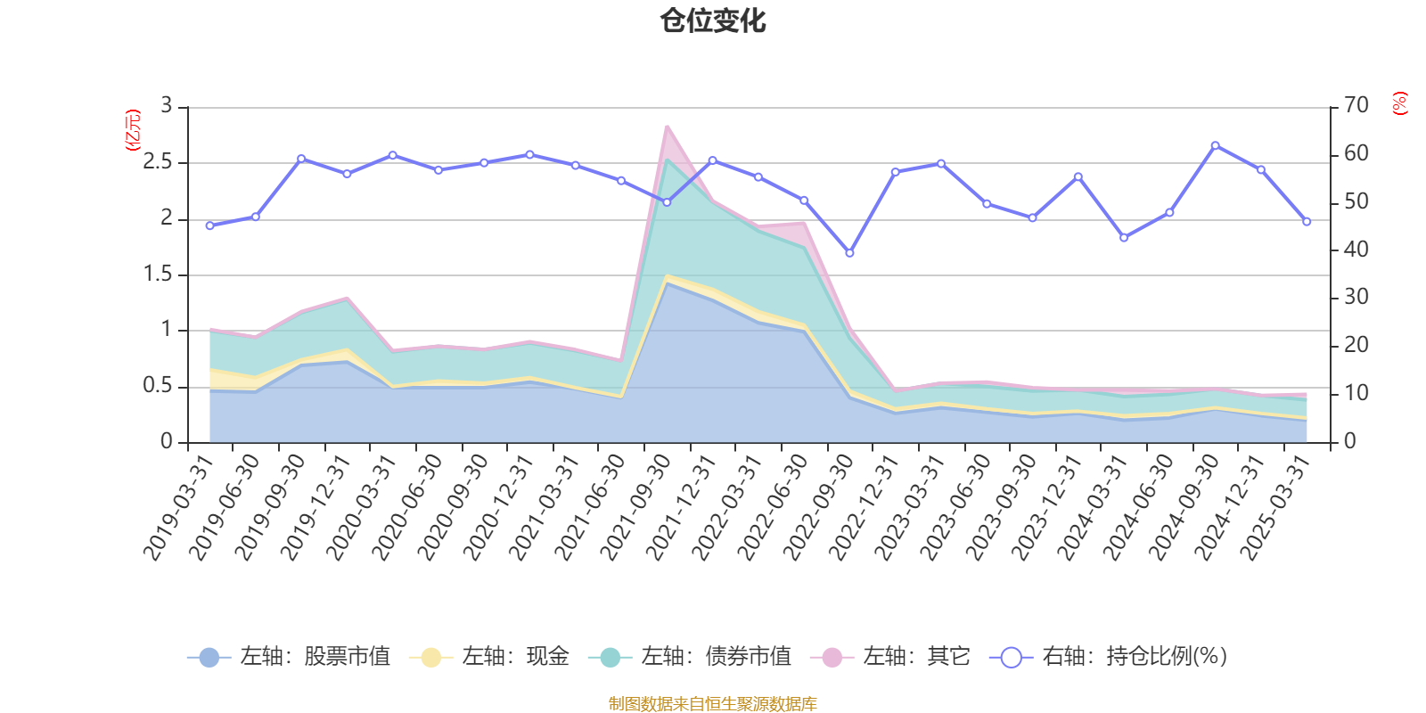 据定期报告数据统计,近三年平均股票仓位为51.04%,同类平均为46.53%。2024年三季度末基金达到61.96%的最高仓位,2022年三季度末最低,为39.54%。