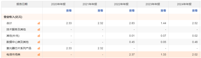 相比之下,数据中心类产品的成长预期较强。得益于AI服务器对大功率CW激光器芯片的需求规模放量。公司CW 70mW激光器芯片的量产,让公司2024年就已经实现百万颗以上出货,贡献营收4800万,同比增长超9倍;2025年上半年,公司数据中心相关业务收入占比也首次超过基本盘,营业收入1.05亿元,同比增长1034%。