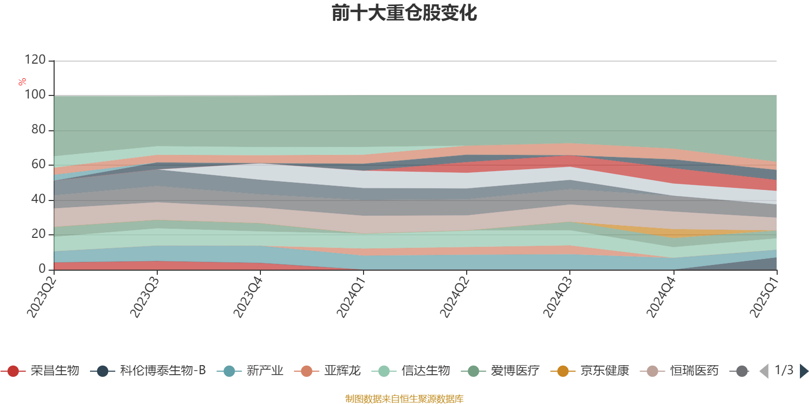 该基金持股集中度较高,近2年前十大重仓股集中度长期超过60%。截至2025年一季度末,基金十大重仓股分别是翰森制药、惠泰医疗、恒瑞医药、科伦博泰生物-B、信达生物、泰格医药、康诺亚-B、康方生物、爱博医疗、新产业。