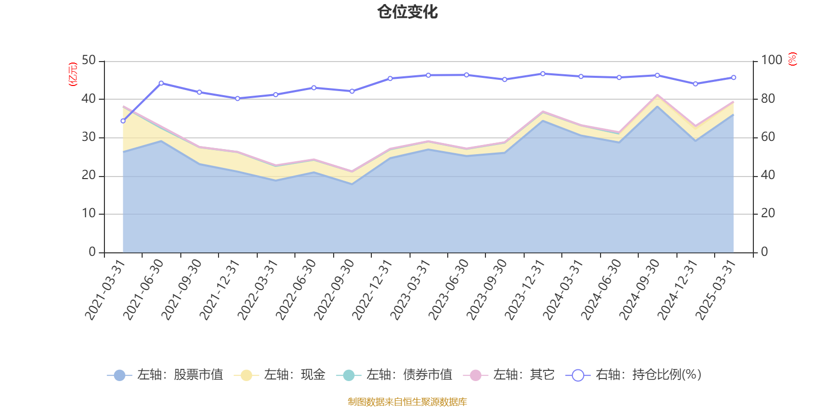 据定期报告数据统计,近三年平均股票仓位为90.49%,同类平均为88%。2023年末基金达到93.4%的最高仓位,2021年一季度末最低,为68.76%。