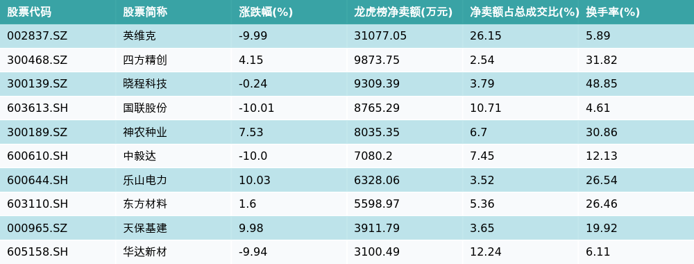 南财智讯4月22日电,南财金融终端数据显示上海股指期货配资,因当日异动登上龙虎榜的个股中上海股指期货配资,龙虎榜中资金净流出最多的前三位分别是英维克(002837.SZ)、四方精创(300468.SZ)与晓程科技(300139.SZ)。其中排名第一的英维克被净卖出3.11亿元,占总成交金额的26.15%。英维克收盘下跌9.99%,换手率为5.89%。净卖出额前10个股详情见下图: